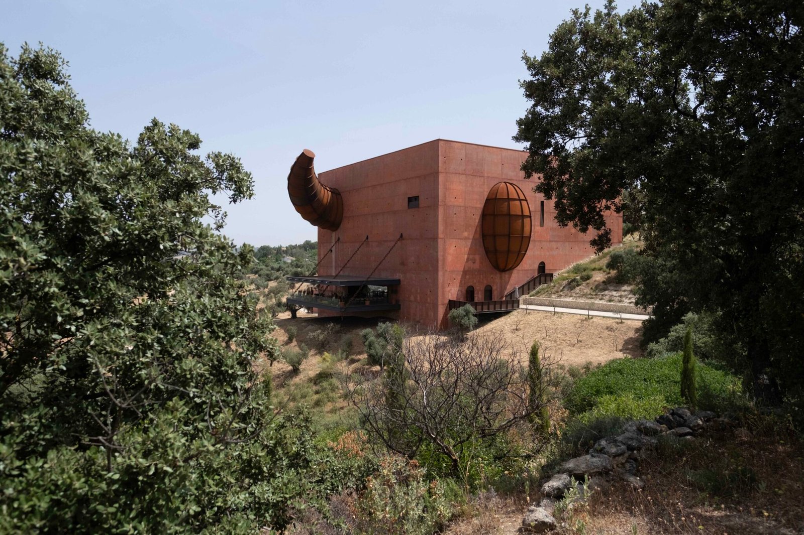 LA Organicse presenta como una obra maestra arquitectónica. Este cubo rojo monolítico, de 30 metros de altura, combina un diseño minimalista con elementos artísticos que rinden homenaje a la identidad andaluza. Desde el ojo gigante de hormigón que adorna su fachada hasta un imponente cuerno de toro de acero, cada detalle refleja una conexión profunda con la tradición y el entorno natural. Según Philippe Starck, el diseño busca «capturar la magia y la poesía del aceite de oliva», respetando las raíces culturales del Mediterráneo.